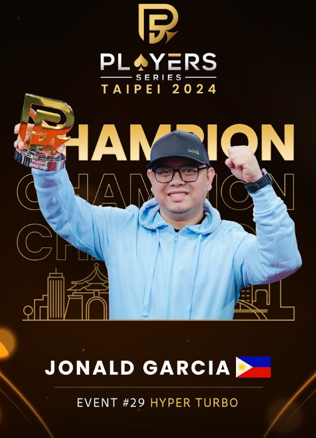 The Hyper Turbo event at PS Taipei 2024 was a fast-paced frenzy, with 51 players battling for every chip in record time. Jonald Garcia from the Philippines mastered the lightning-fast action, outlasting the field to claim the title and a prize of NT$73,200! A thrilling performance in a tournament where every second counted!