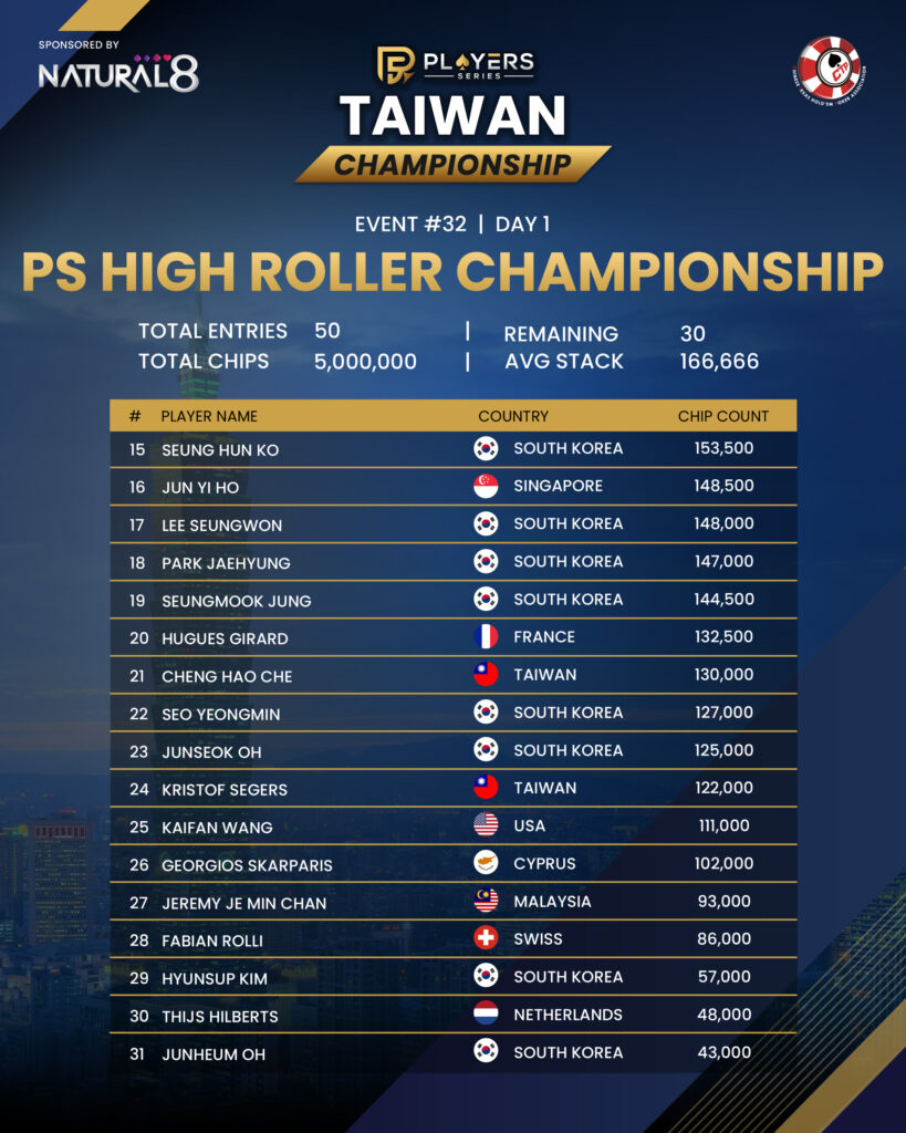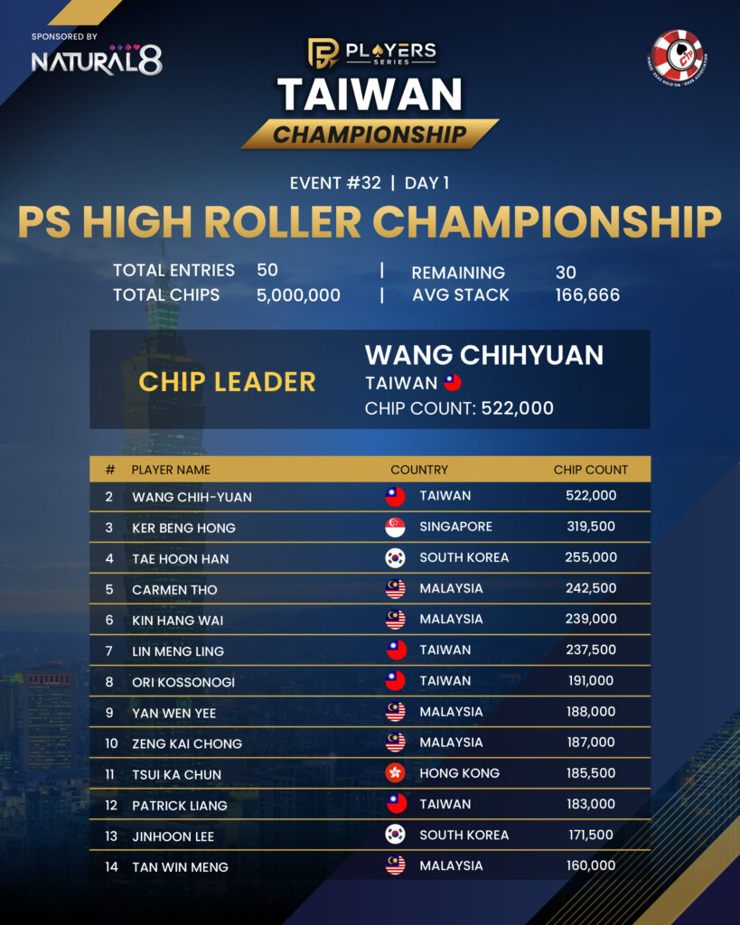 After ten fast-paced 40-minute levels, Taiwan’s Wang Chih Yuan finished Day 1 of the PS High Roller Championship with the largest stack, bagging 522,000 chips. Out of 50 entrants, 30 players will return on Wednesday to continue the fight for the prestigious trophy.