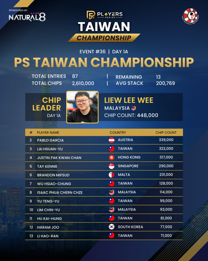 Flight A of the PS Taiwan Championship wrapped after sixteen intense 40-minute levels at the Asia Poker Arena. From 87 entries, only 13 players advanced to Day 2, all guaranteeing a payout. Malaysia’s Liew Lee Wee led the way with 448,000 chips, using well-timed aggression and strategic all-ins to steadily outmaneuver his opponents.