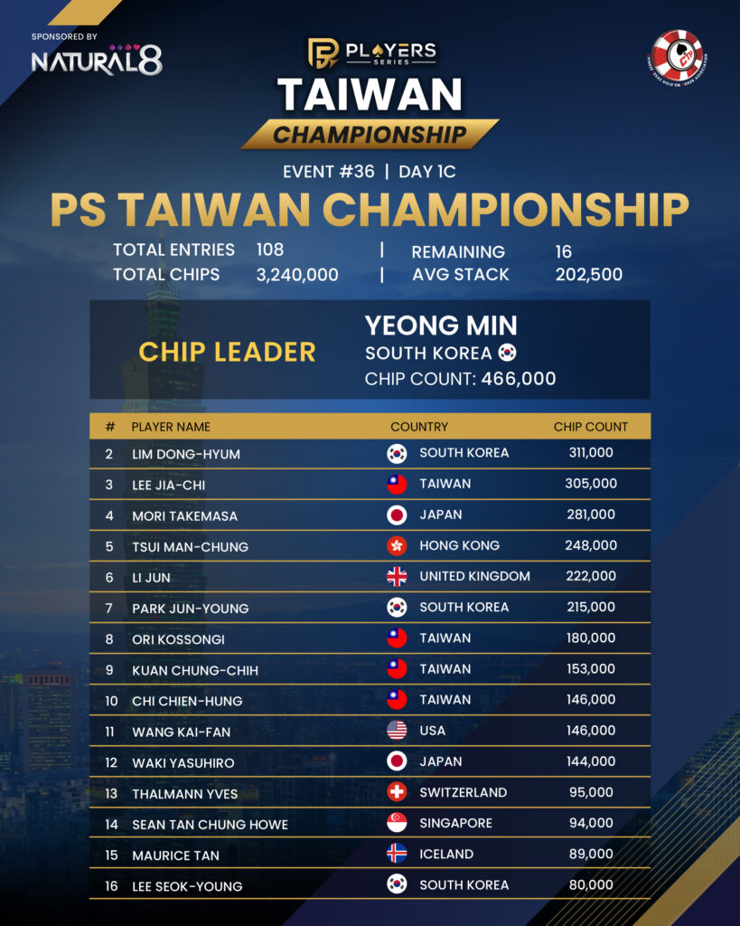 - Play, where possible, will commence 9-handed and move to 8-handed on Day 2.