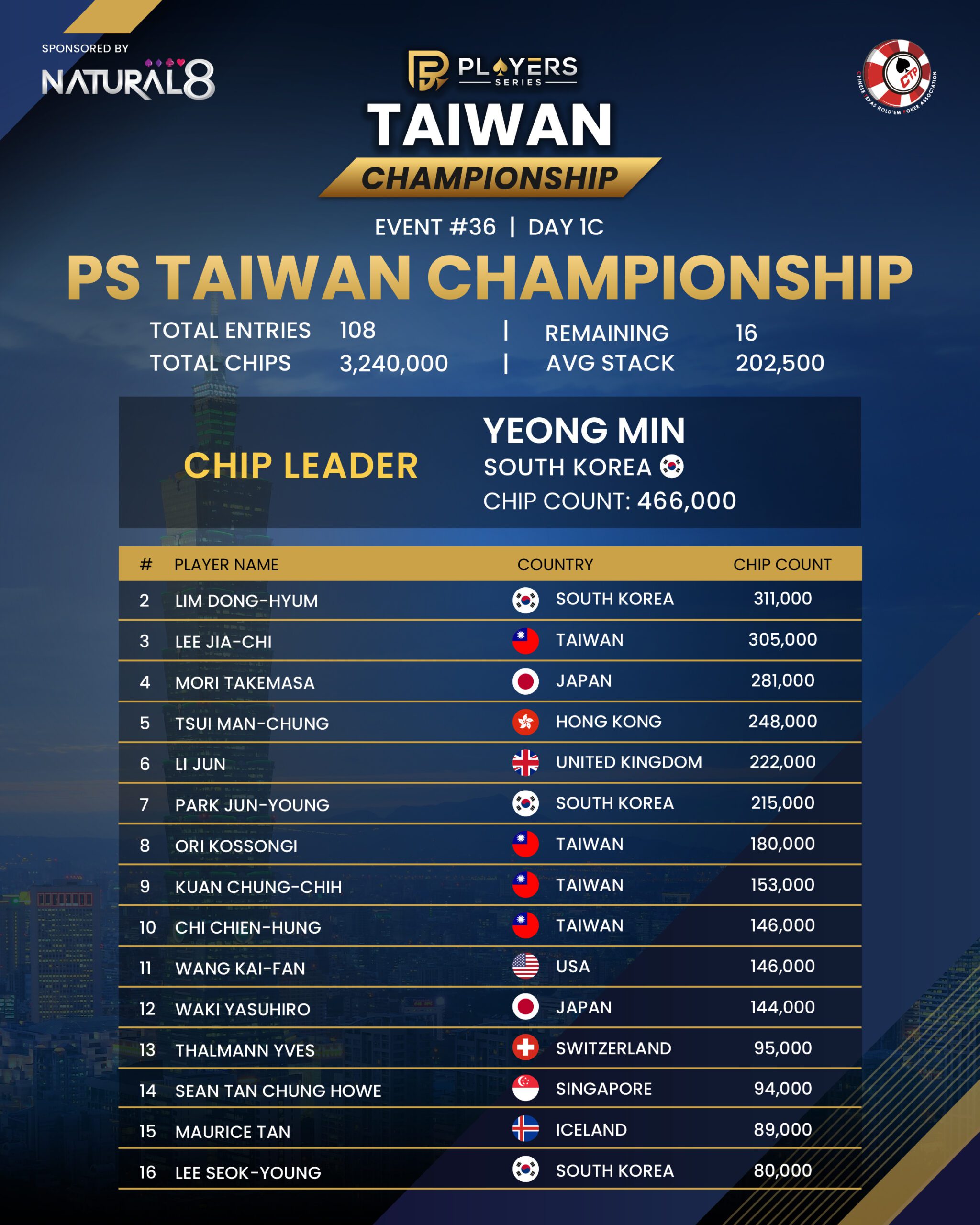 Leading the charge is 🇰🇷 Yeong Min, who closes the day with a commanding 466,000-chip stack, setting the pace among the Flight C qualifiers.