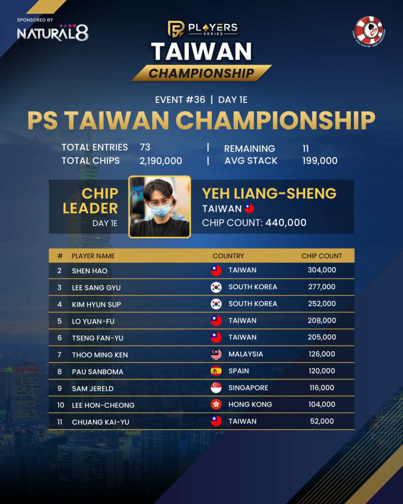 Flight 1E of the PS Taiwan Championship featured 73 entries, with only 11 players advancing to Day 2. Taiwan’s Yeh Liang Sheng topped the chip counts with 440,000, much of it earned in a heroic late-hand call against bubble boy Sean Ooi. Close behind, Taiwan’s Shen Hao bagged 304,000, while South Korea’s Lee Sanggyu completed the flight’s podium with 277,000 chips.