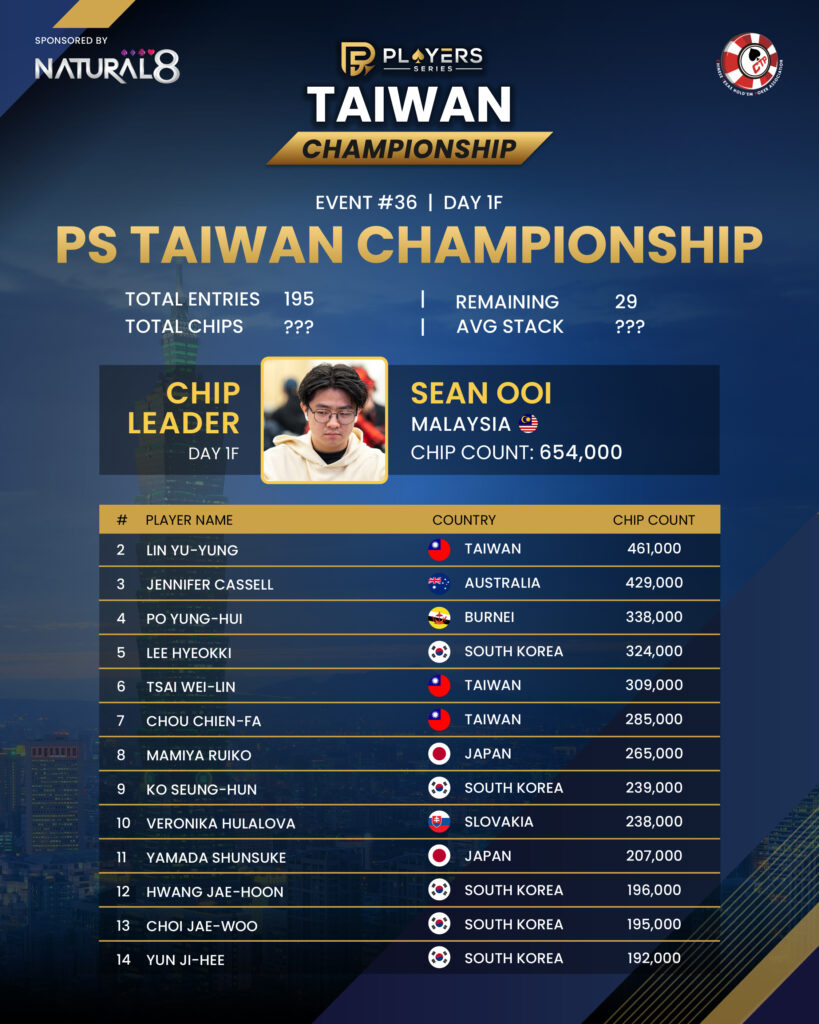 The penultimate flight of the PS Taiwan Championship saw 195 players take their shot, with 29 surviving 17 fast-paced 30-minute levels to reach the money. Sean Ooi, who had been the bubble boy in Flight 1E, bounced back in style to dominate the field, bagging an impressive 654,000 chips. Taiwan’s Lin Yu Yung followed with 461,000 chips, while Australia’s Jennifer Cassell secured third place with 429,000.