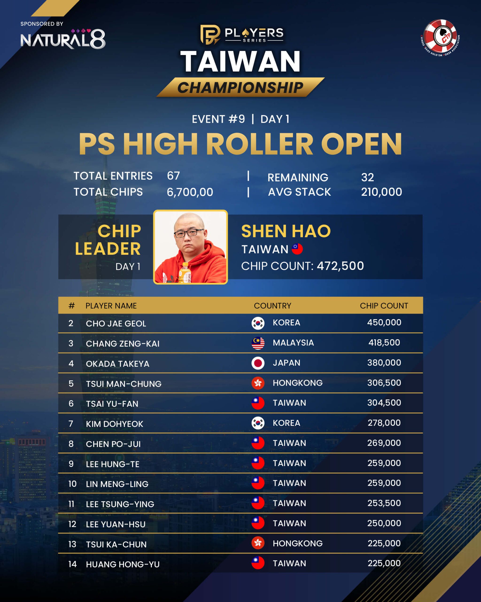 Setting the pace is 🇹🇼 Shen Hao, who bags a commanding 472,500 chips following a steady and disciplined performance throughout the session. Close behind is 🇰🇷 Cho Jae Geol, who builds consistently from the opening hands and finishes with 450,000 chips to keep the pressure firmly on the leader.