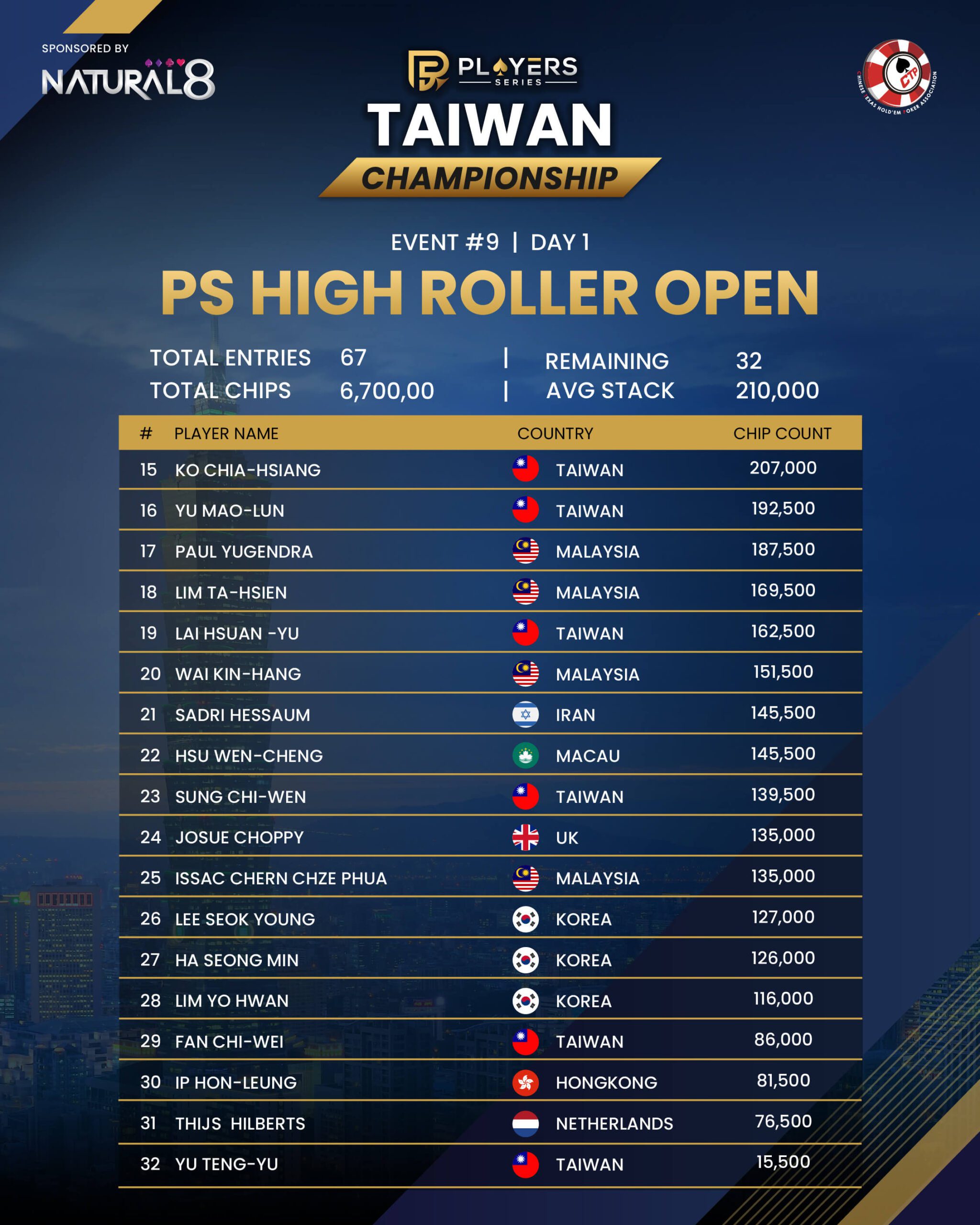 #9: PS High Roller Open (8-Handed) – Day 1 – NT$2,500,000 GTD