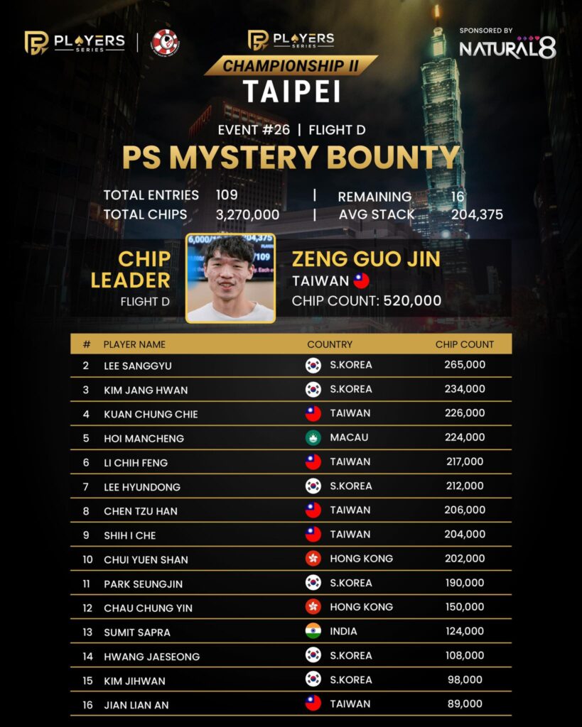 From 109 entries, 16 players advanced in Flight D of the PS Mystery Bounty, led by Taiwan’s Zeng Guo Jin.