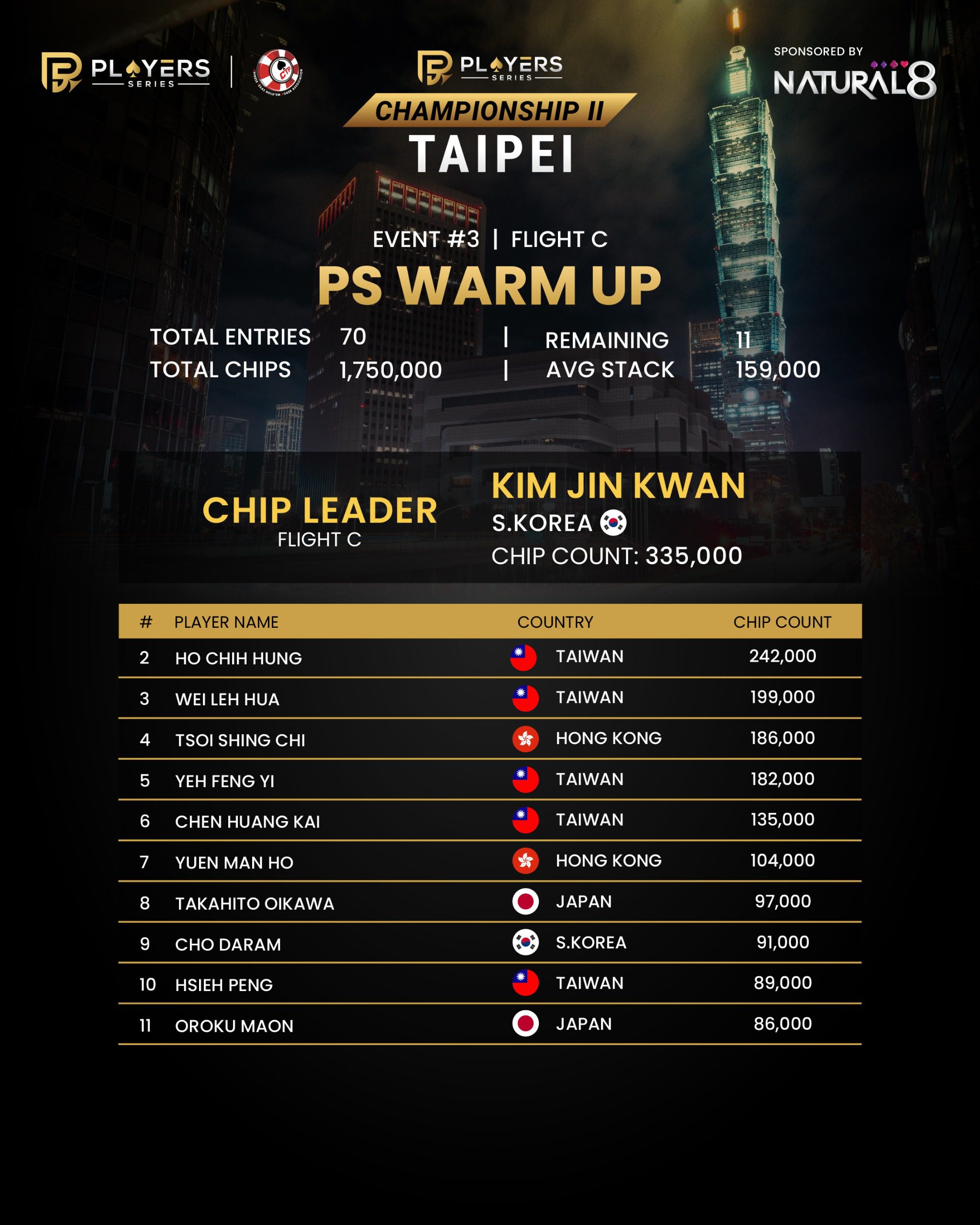 Flight C of the PS Warm Up delivers another intense chapter, drawing 70 entries before narrowing to just 11 survivors who successfully secure their seats into the next stage. Rising above the field is 🇰🇷 Kim Jin Kwan, who closes the flight as chip leader with a commanding 335,000.