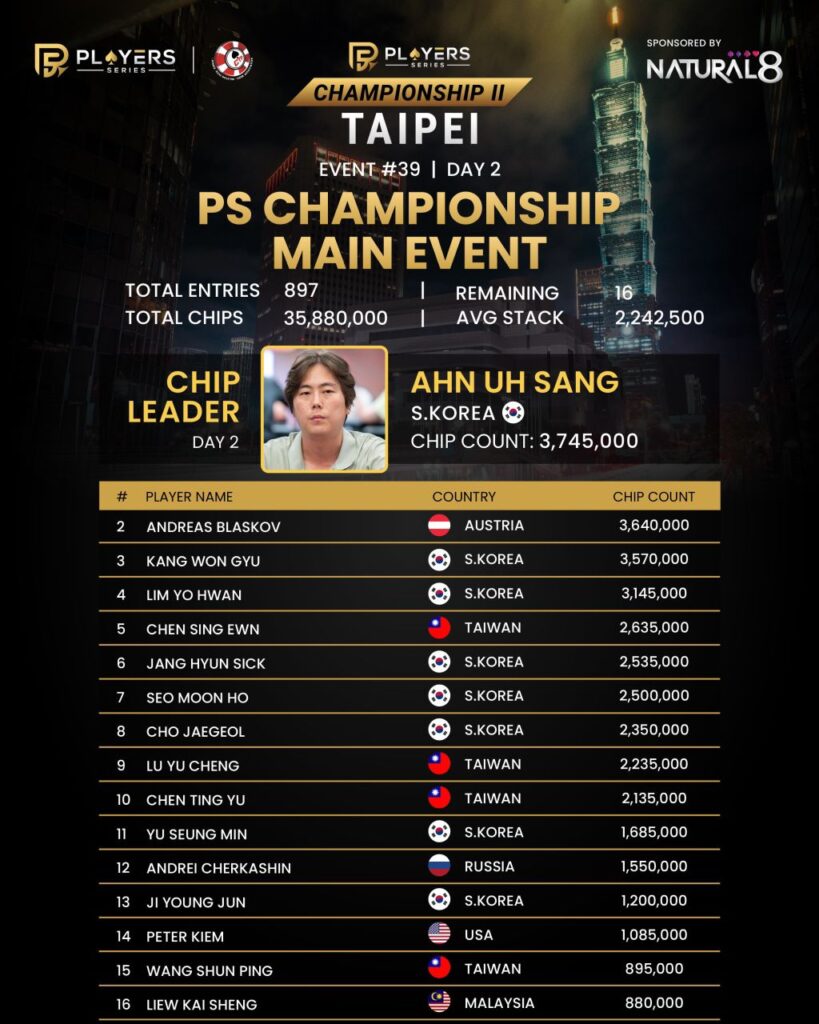 South Korea’s Ahn Uh Sang topped Day 2 of the PS Championship Main Event, with 16 players advancing from 897 entries.