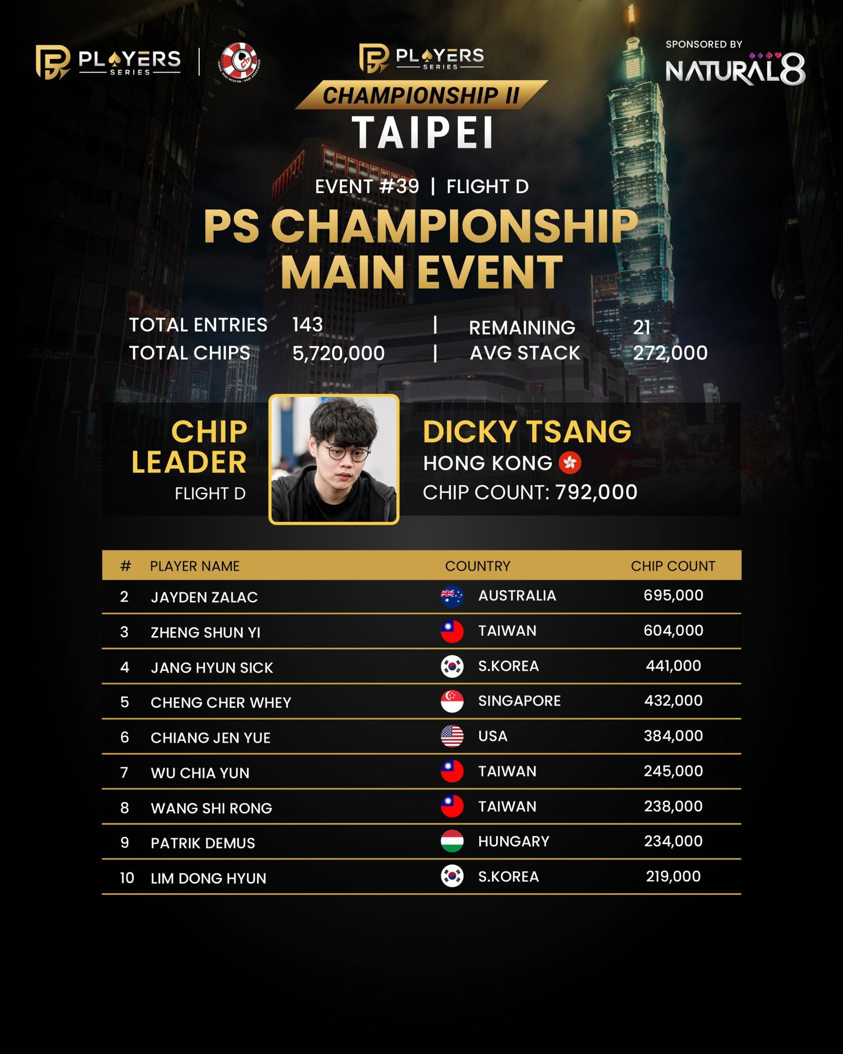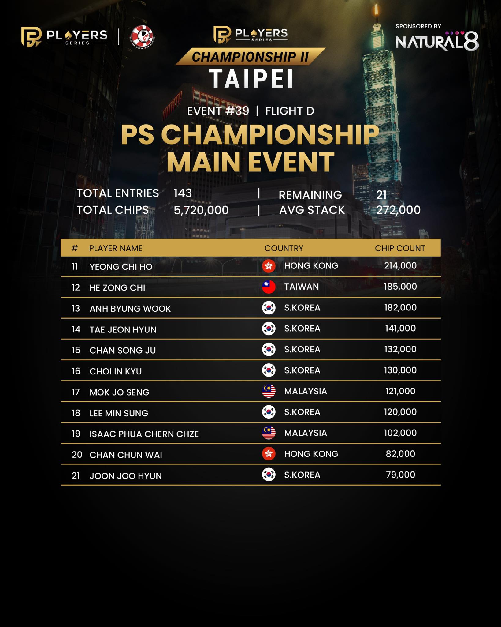 #39: PS Championship Main Event – No-Limit Hold’em – Flight D – NT$20,000,000 GTD