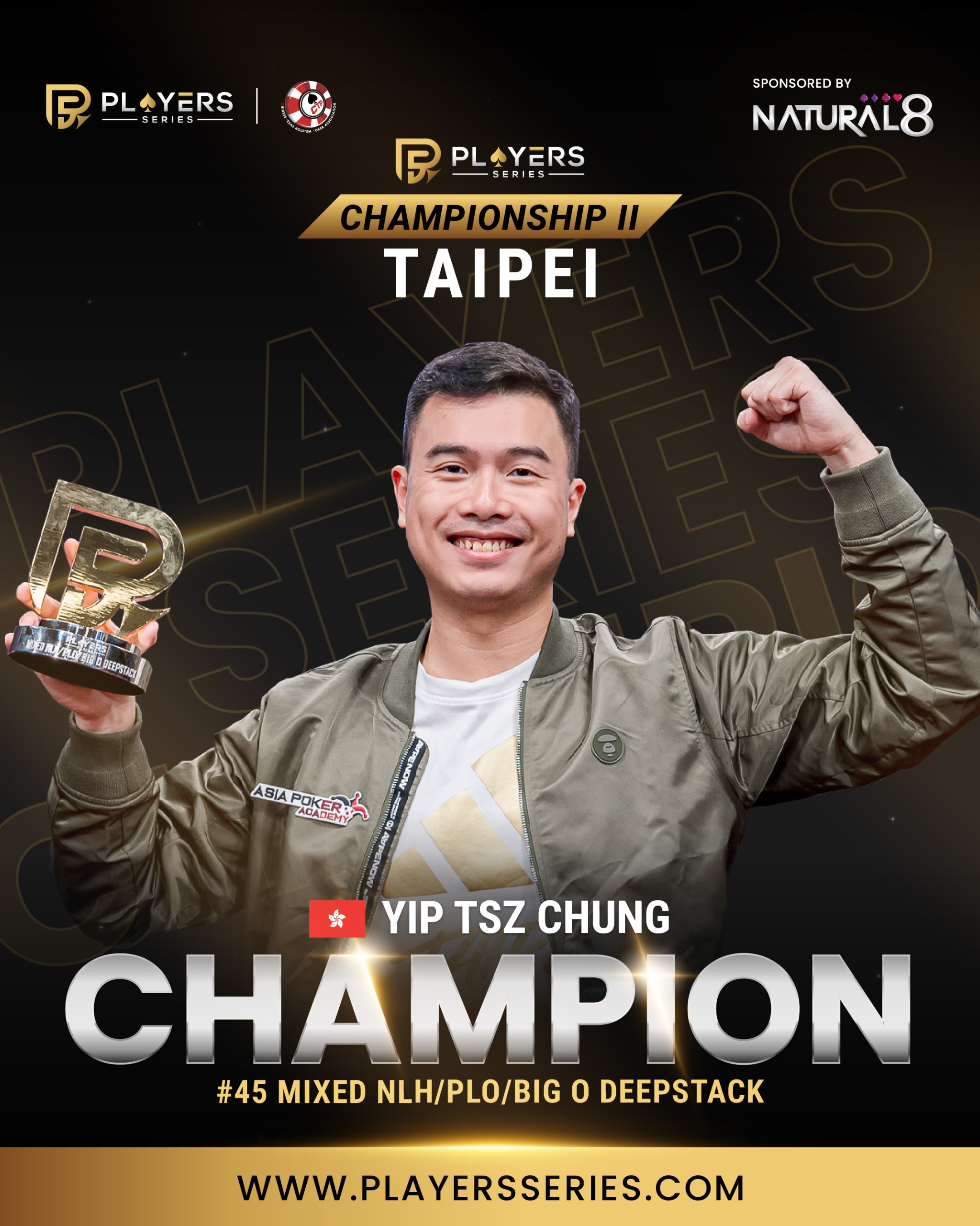 Mastering not just one game, but three! Yip Tsz Chung from Hong Kong rose above a tough field of 31 entries to claim victory in the #45 Mixed NLH/PLO/Big O Deepstack, earning NT$96,600 and the champion’s PS trophy.