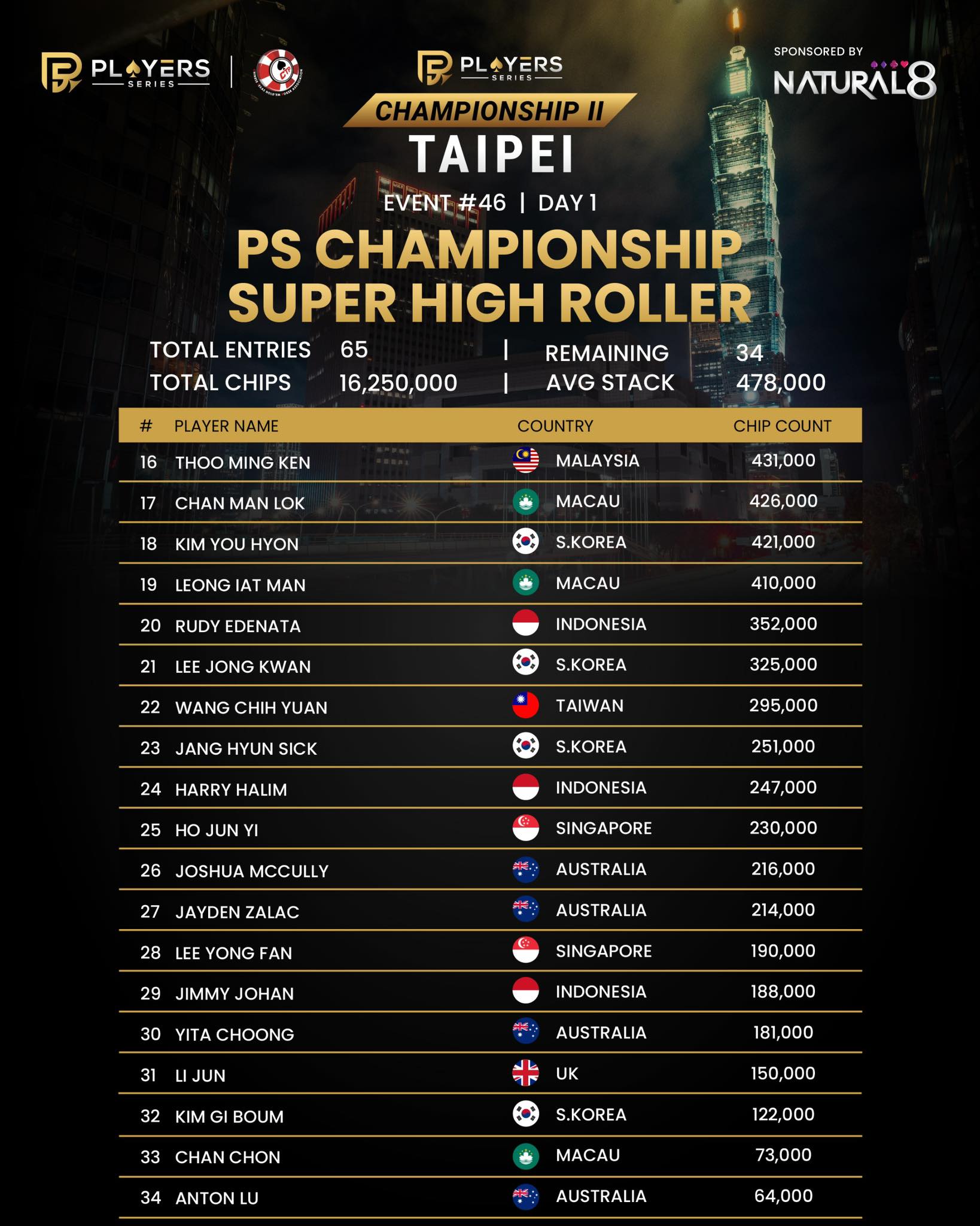 #46: PS Championship Super High Roller (8-Handed) – No-Limit Hold’em – Day 1 – NT$5,500,000 GTD