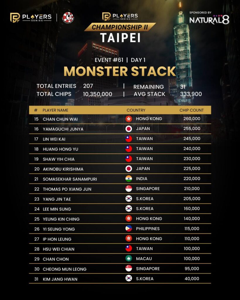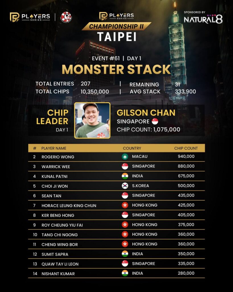 Singapore’s Gilson Chan led Day 1 of the Monster Stack, with 31 players advancing from 207 entries.