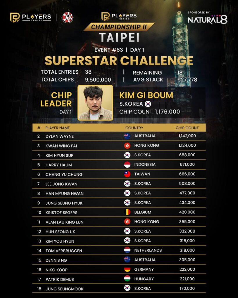South Korea’s Kim Gi Boum led Day 1 of the Superstar Challenge, with 18 players advancing from 38 entries.