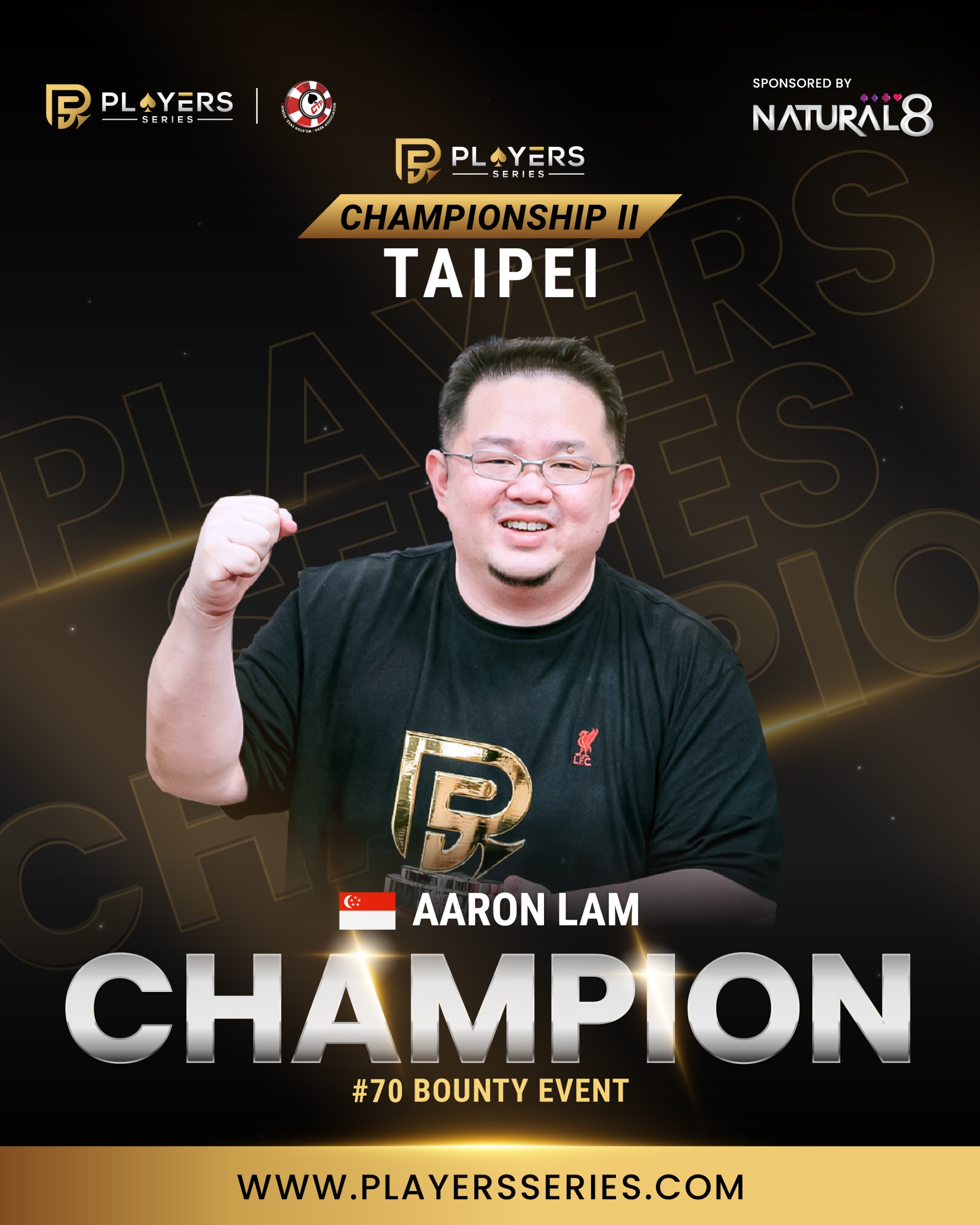 In this thrilling Bounty Event, where every hand was a battle to knock out opponents and claim extra rewards, Aaron Lam from Singapore proved unstoppable. Outlasting a competitive field of 62 entries, he claimed the title and NT$83,300 in winnings!