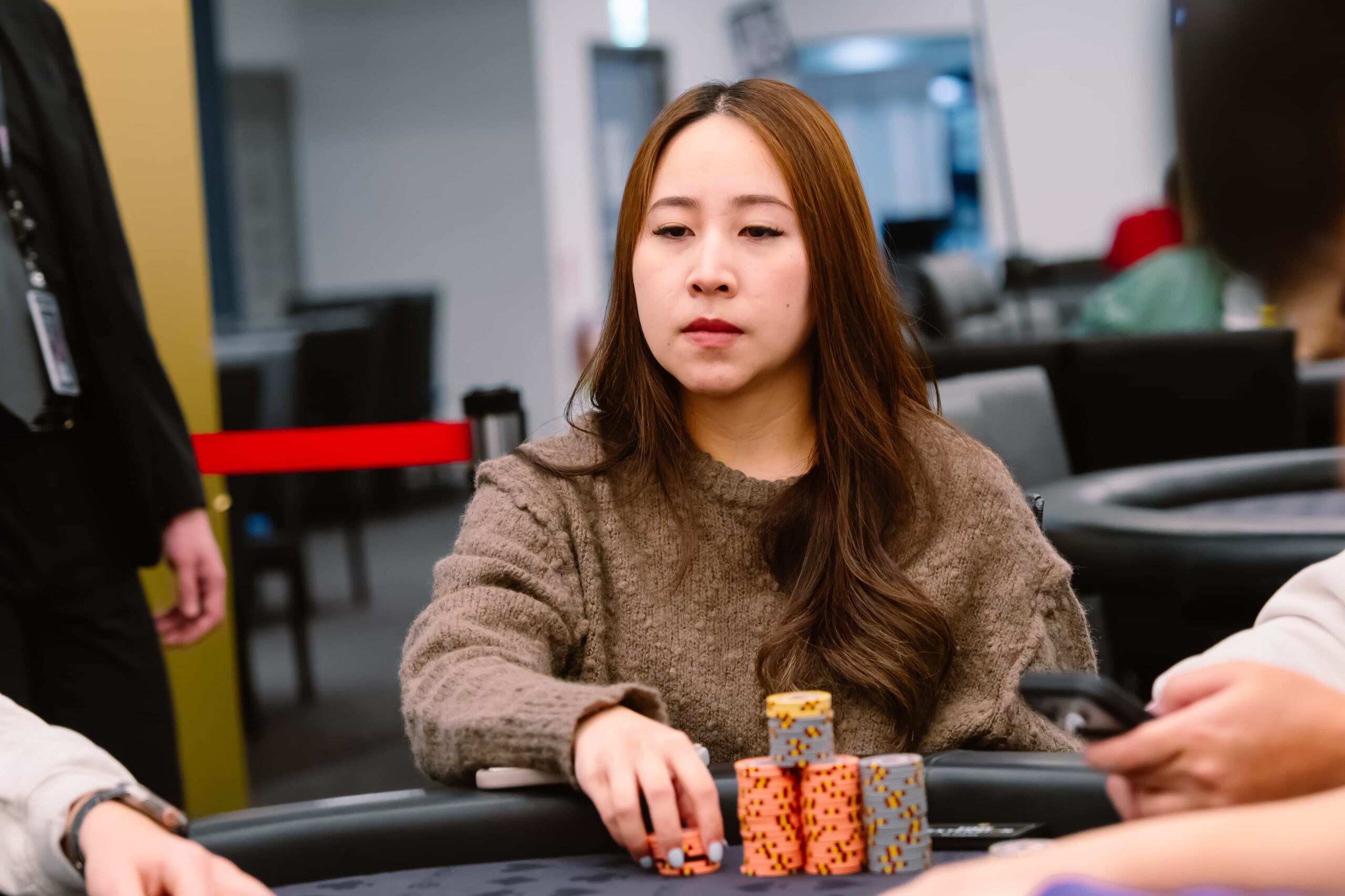 Cheng carries in the lead with Jung right on his heels. The lead shifts multiple times, with Segers and πΉπΌ Jing Hong Chen also spending time at the top. It isnβt until play reaches four-handed that Jung pulls ahead after cracking Chen’s jacks with sevens turned flush then eliminates Segers in 3rd place.