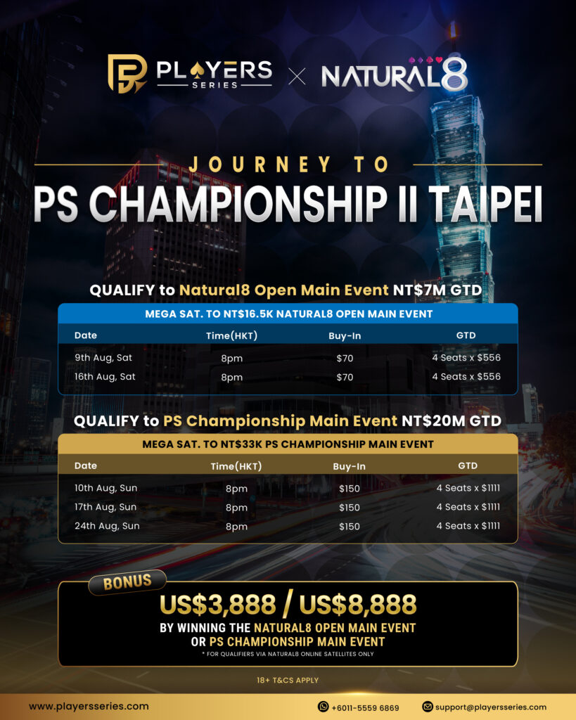 Whether you’re gunning for the NT$16,500 Natural8 Open Main Event or aiming high with the NT$33,000 PS Championship Main Event, Mega Satellites could be your first step toward glory.