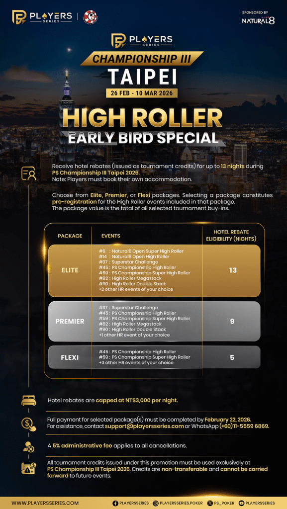 The High Roller Early Bird Special is back for PS Championship III Taipei 2026—created exclusively for our most discerning players. This limited-time offer combines priority High Roller access with generous hotel rebates, delivered through three curated package tiers: Elite, Premier, and Flexi.