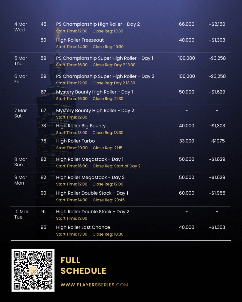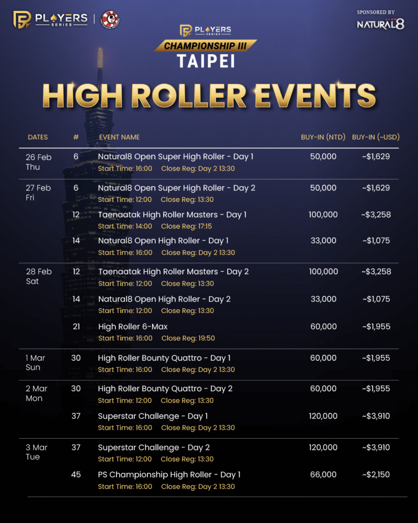 The High Roller series at PS Championship III Taipei 2026 delivers everything that defines top-tier tournament poker: elite fields, diverse formats, and stakes that demand your best game. This isn’t just where big pots are played—it’s where reputations are built.