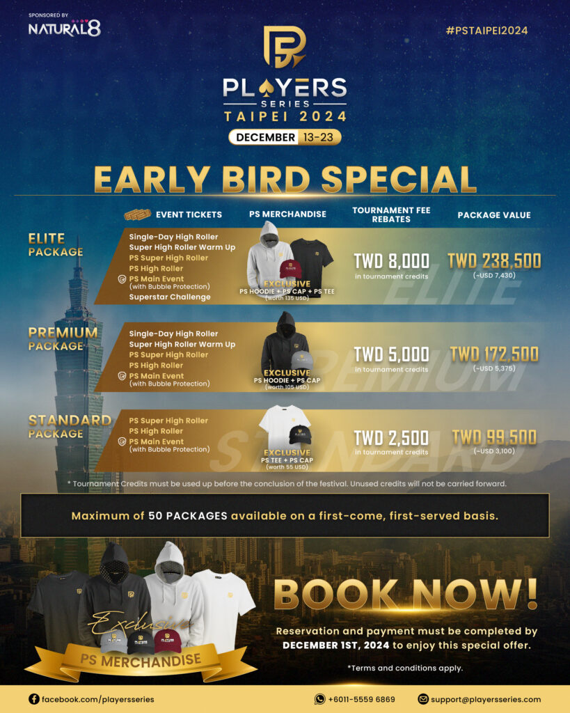 2. Exclusive PS Merchandise – Each package also includes specially designed Players Series branded merchandise, ranging in value up to USD $135. Items include the sought-after PS Hoodies, Signature Tees, and Caps. These items will not only make players feel like part of the PS community but also provide a great keepsake from the event.