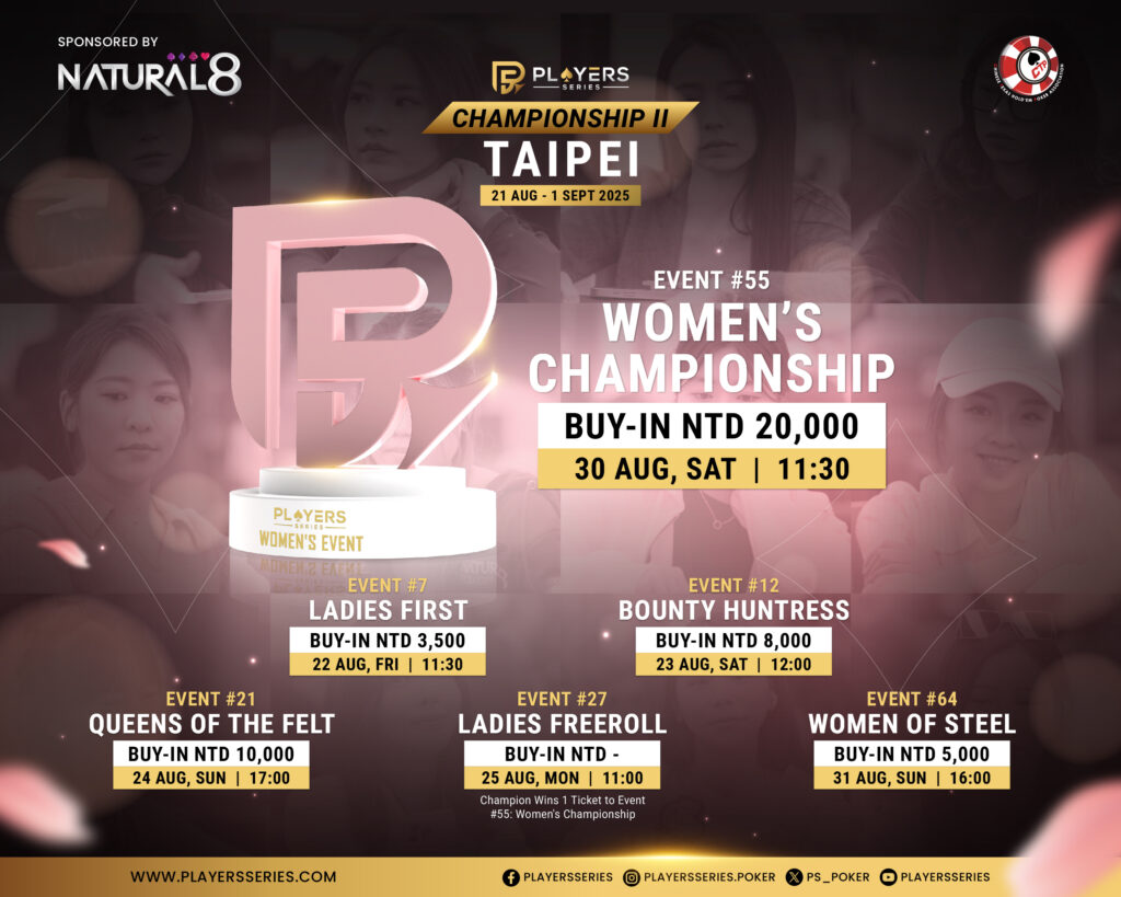 Across 12 action-packed days, female players of all levels are invited to join the fun with buy-ins ranging from absolutely free to TWD 20,000 (~USD 695). Whether you’re a seasoned grinder or new to the game, there’s a seat waiting for you.